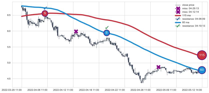 下跌趋势03-29 11:00-05-12 14:00,均线115, 60确认关键阻力2处