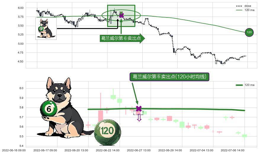 形态多维评估: ⚀ 2022-06-24 13:00:00-小时显现 葛兰威尔均线 120小时均线 第⑥卖出点 走势反转见顶信号,后市看跌,卖出信号