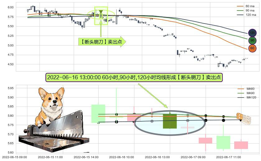 形态多维评估: ⚀ 2022-06-16 13:00:00小时显现 60小时-90小时-120小时均线 【断头铡刀】卖出点 看空信号,后市看跌,卖出