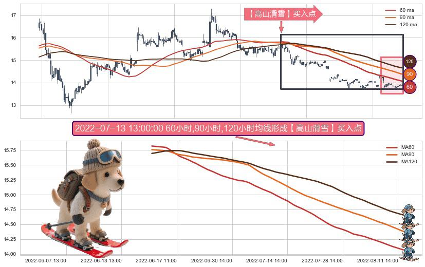 形态多维评估: ⚀ 2022-06-15 13:00:00小时-2022-08-12 14:00:00小时显现 60小时-90小时-120小时均线 【高山滑雪】买入点 看多信号,后市看涨,买入