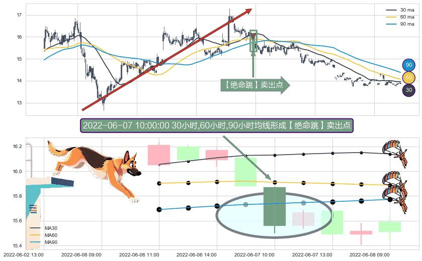 形态多维评估: ⚀ 2022-06-07 10:00:00小时显现 30小时-60小时-90小时均线 【绝命跳】卖出点 看空信号,后市看跌,卖出