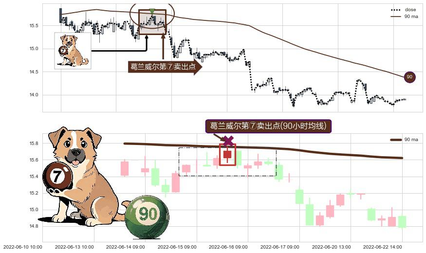 形态多维评估: ⚀ 2022-06-15 13:00:00-小时显现 葛兰威尔均线 90小时均线 第⑦卖出点 下降趋势的中继信号,后市看跌,卖出信号