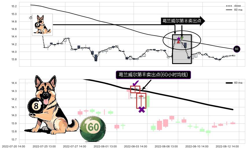 形态多维评估: ⚀ 2022-08-03 13:00:00-小时显现 葛兰威尔均线 60小时均线 第⑧卖出点 下降趋势的中继信号,后市看跌,卖出信号