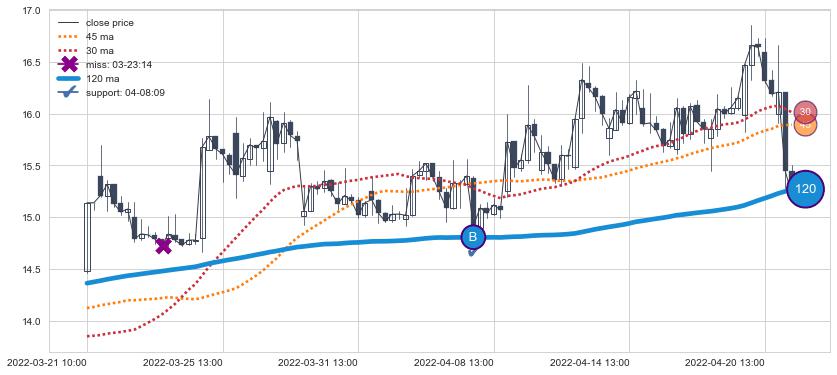上涨趋势05-05 13:00-06-07 10:00,均线120, 45, 30确认关键支撑4处