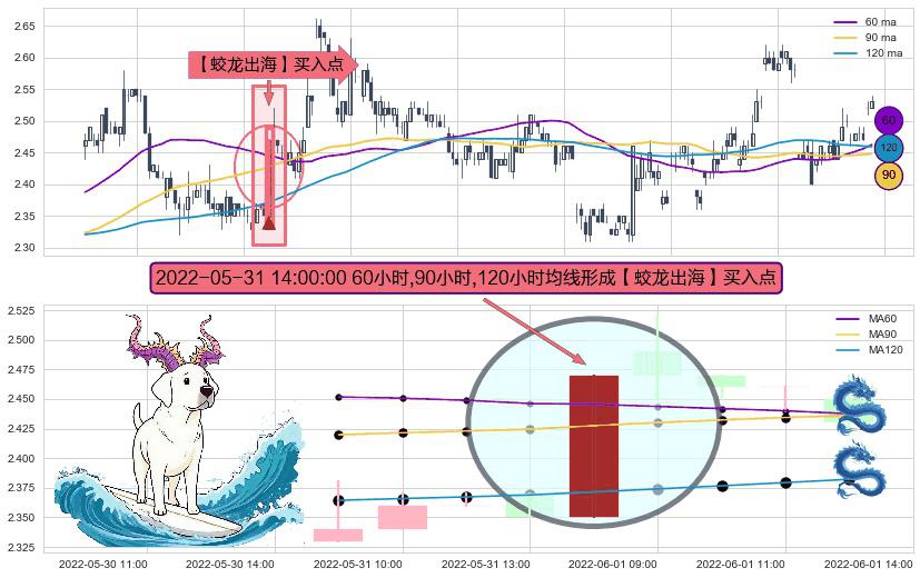⚀ 2022-05-31 14:00:00小时显现 60小时-90小时-120小时均线 【蛟龙出海】买入点 看多信号,后市看涨,买入
