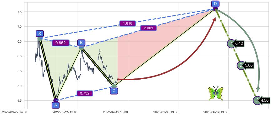 ➣ D点拟合预测价格7.60,距离最后交易收盘价格5.22相差 +45.62%