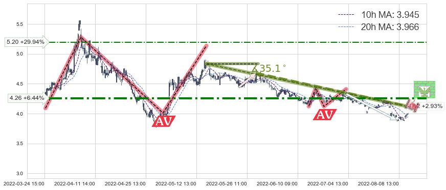 ♘ 阻力价格位5.20,可信任强度54.90%,距离最后交易2022-08-12 14:00形成的收盘价格4.00相差 +29.94%