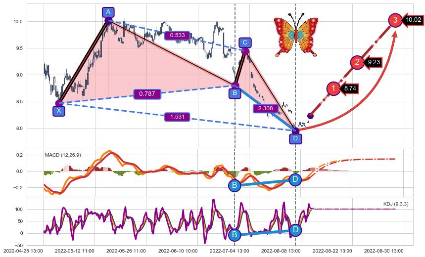 ➣ 已完成【蝴蝶】形态起点X: 04-28:13, 终点D: 08-03:14, 共231交易小时