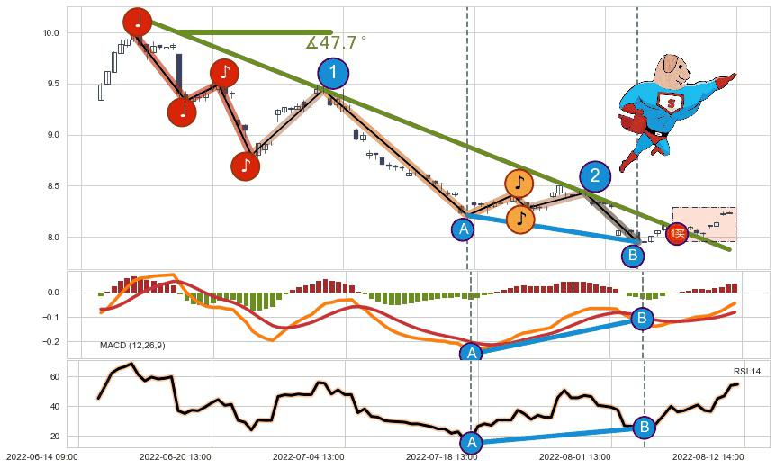 从2022-06-15 13:00至2022-08-12 13:00,共包含91个小时,阶段股价下跌-18.76%,阶段股价变动位移路程比: 1 : 3,下跌趋势角度: 47.7