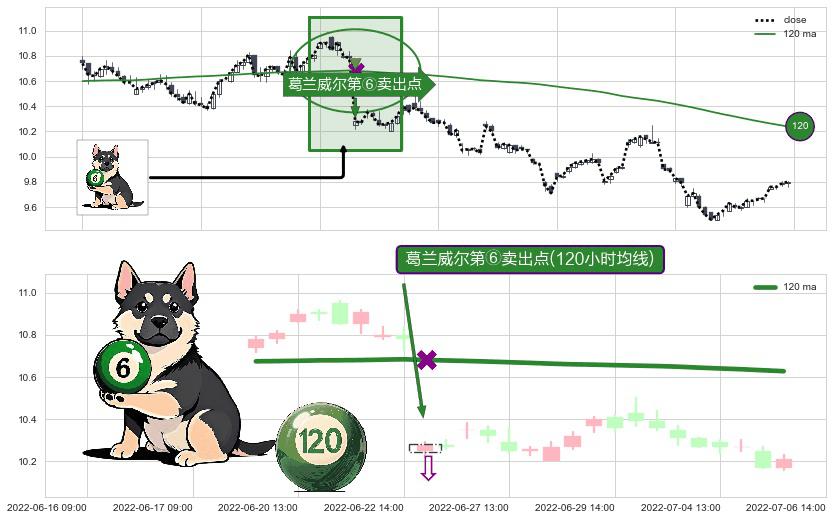 形态多维评估: ⚀ 2022-06-23 13:00:00-小时显现 葛兰威尔均线 120小时均线 第⑥卖出点 走势反转见顶信号,后市看跌,卖出信号