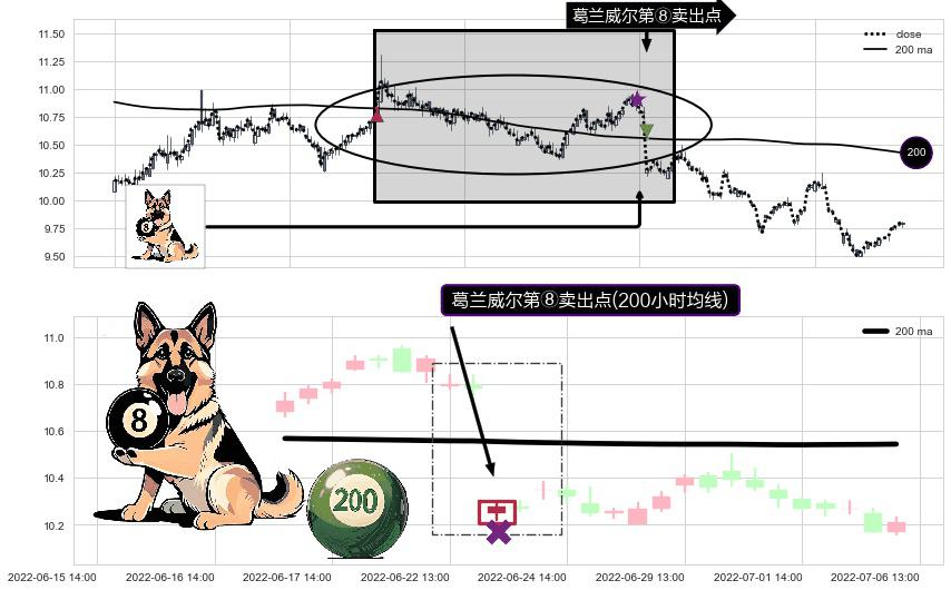 形态多维评估: ⚀ 2022-06-23 13:00:00-小时显现 葛兰威尔均线 200小时均线 第⑧卖出点 下降趋势的中继信号,后市看跌,卖出信号
