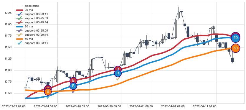 上涨趋势03-22 09:00-04-12 09:00,均线50, 20, 30确认关键支撑3处