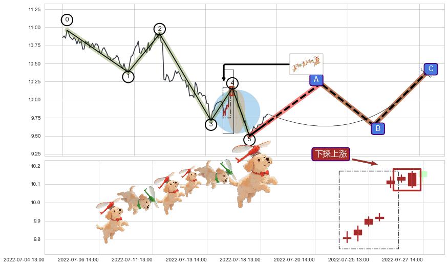 从2022-07-15 14:00至2022-07-22 13:00,共包含10个小时,阶段股价上涨1.05%,阶段股价变动位移路程比: 1 : 4