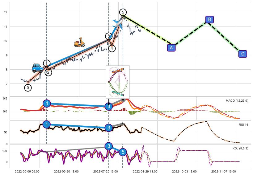 ➢ 1,3,5驱动浪MACD, RSI, KDJ走势都出现【常规背离】反转信号增强