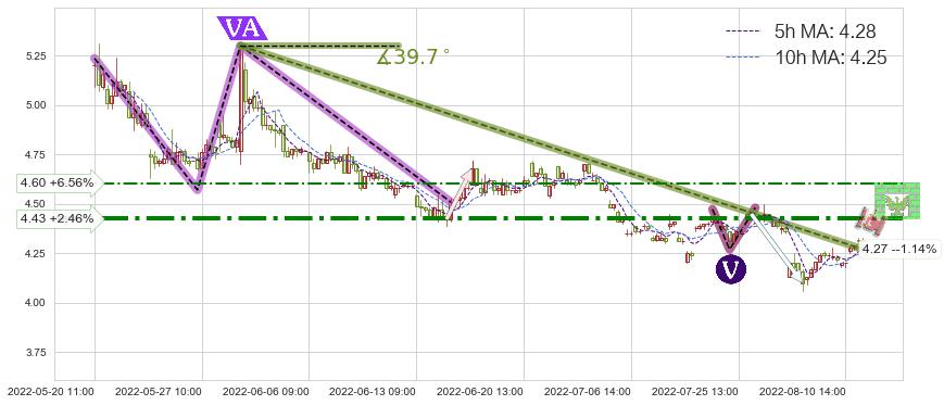 ♘ 阻力价格位4.60,可信任强度49.79%,距离最后交易2022-08-12 14:00形成的收盘价格4.32相差 +6.56%