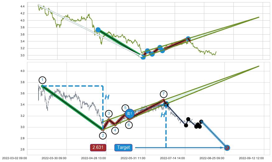 ➣ 最小中继整理跌幅→𝐇: 0.43818 (下侧直角边第一支撑点②与斜边垂直距离)
