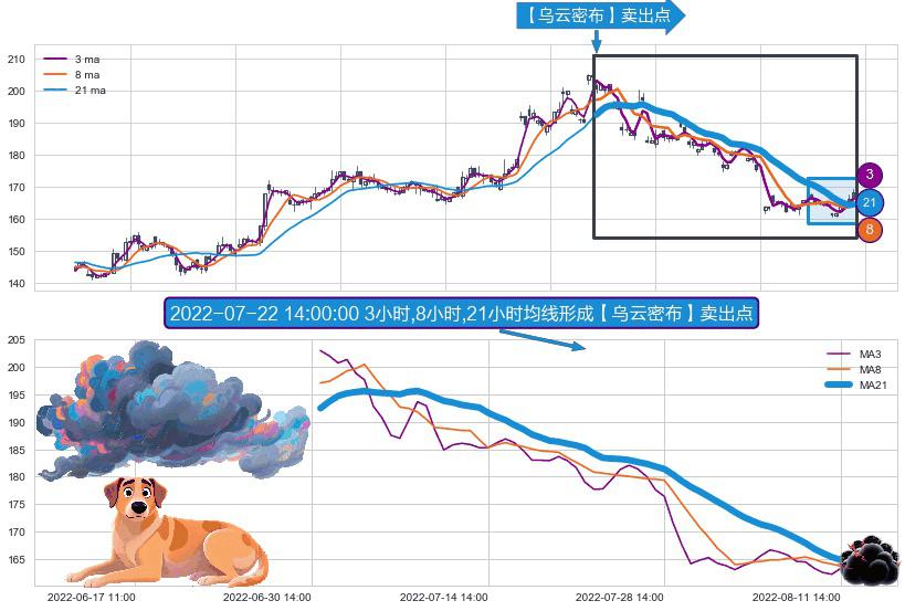 形态多维评估: ⚀ 2022-07-01 13:00:00小时-2022-08-12 14:00:00小时显现 3小时-8小时-21小时均线 【乌云密布】卖出点 看空信号,后市看跌,卖出