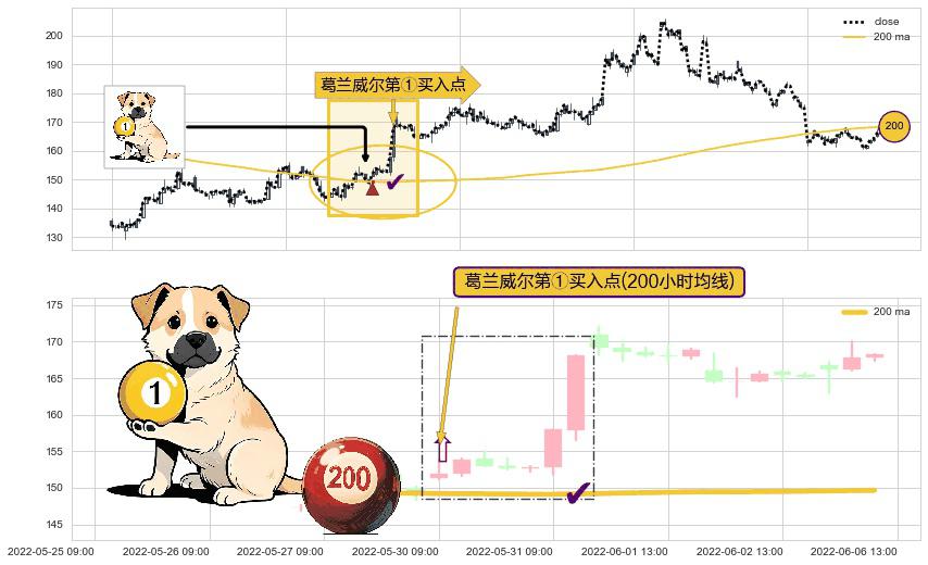 形态多维评估: ⚀ 2022-05-30 09:00:00-小时显现 葛兰威尔均线 200小时均线 第买①入点 走势反转见底信号,后市看涨,买进信号