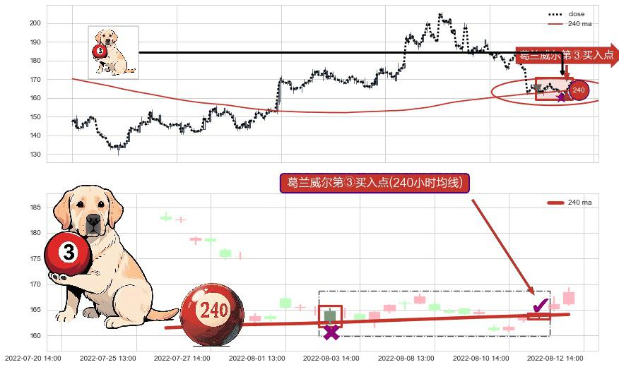 形态多维评估: ⚀ 2022-08-11 14:00:00-小时显现 葛兰威尔均线 240小时均线 第③买入点 上升趋势的中继信号,后市看涨,买进信号