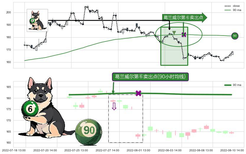 形态多维评估: ⚀ 2022-07-27 13:00:00-小时显现 葛兰威尔均线 90小时均线 第⑥卖出点 走势反转见顶信号,后市看跌,卖出信号