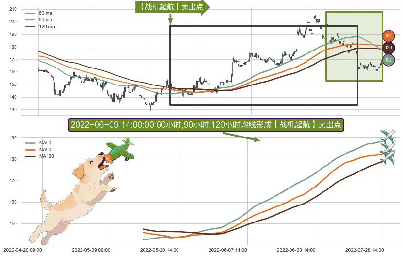 形态多维评估: ⚀ 2022-05-13 14:00:00小时-2022-07-28 13:00:00小时显现 60小时-90小时-120小时均线 【战机起航】卖出点 看空信号,后市看跌,卖出