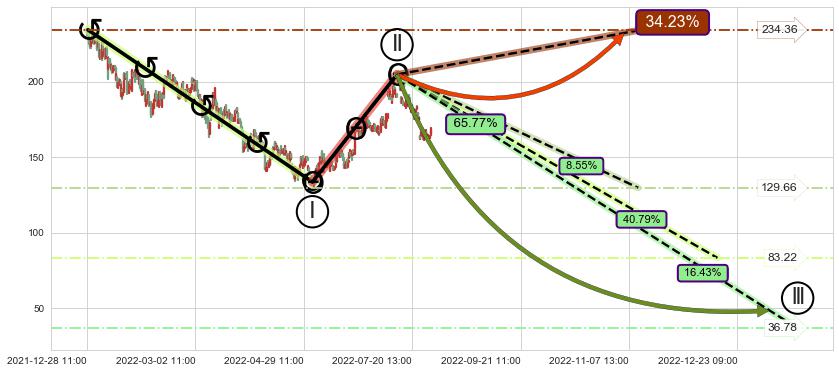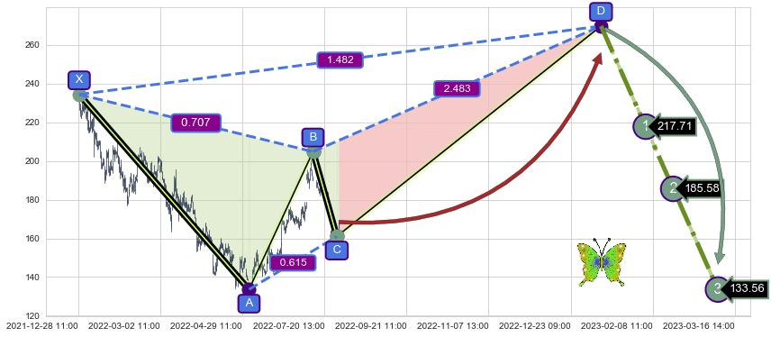 ➣ D点拟合预测价格269.73,距离最后交易收盘价格168.44相差 +60.14%