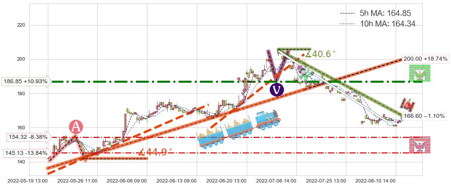 ♘ 阻力价格位186.85,可信任强度80.73%,距离最后交易2022-08-12 14:00形成的收盘价格168.44相差 +10.93%