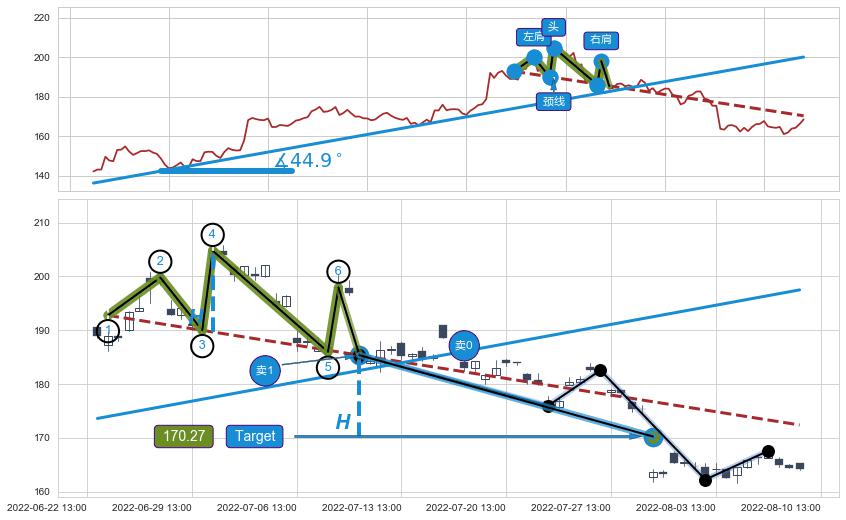 从2022-06-14 11:00至2022-07-08 14:00,共包含48个小时,阶段股价上涨18.72%,阶段股价变动位移路程比: 1 : 3,上涨趋势角度: 62.8,2022-06-30 13:00向⇪形成缺口,跳空上涨+7.78%