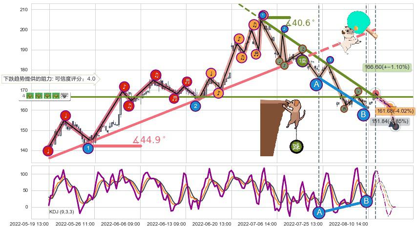➢ 预测:2022-08-16 10:00,【试探阻力】稳定目前下跌趋势的前提下,预测价格:161.68