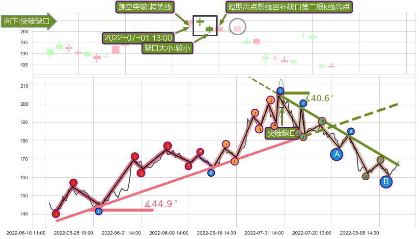 从2022-06-30 13:00至2022-08-12 13:00,共包含63个小时,阶段股价下跌-19.80%,阶段股价变动位移路程比: 1 : 3,下跌趋势角度: 40.6,2022-07-11 13:00向↘︎形成缺口,跳空下跌-6.65%˚
