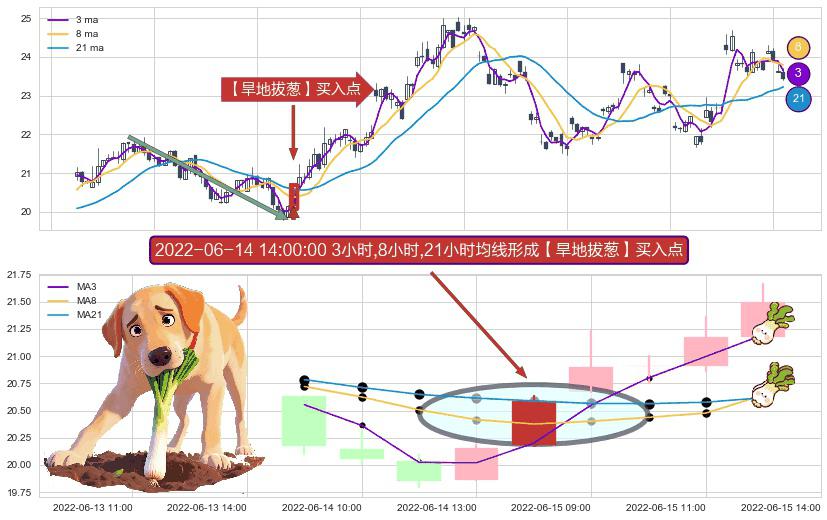 ⚀ 2022-06-14 14:00:00小时显现 3小时-8小时-21小时均线 【旱地拔葱】买入点 看多信号,后市看涨,买入