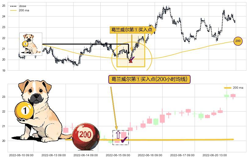 ⚀ 2022-06-14 13:00:00-小时显现 葛兰威尔均线 200小时均线 第买①入点 走势反转见底信号,后市看涨,买进信号