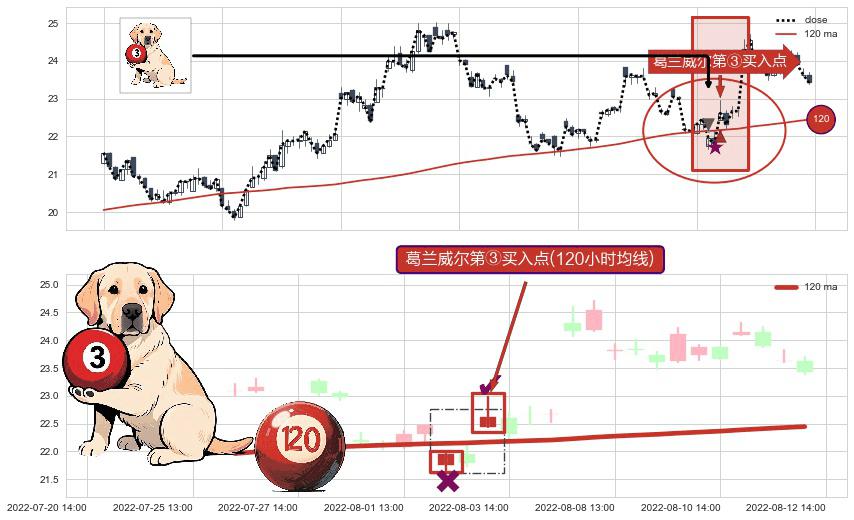 ⚀ 2022-08-03 13:00:00-小时显现 葛兰威尔均线 120小时均线 第③买入点 上升趋势的中继信号,后市看涨,买进信号
