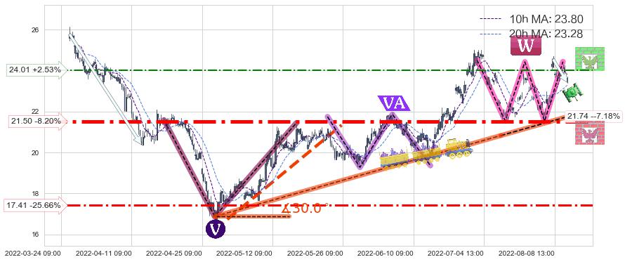 ♘ 支撑价格位21.50,可信任强度93.69%,距离最后交易2022-08-12 14:00形成的收盘价格23.42相差 -8.20%
