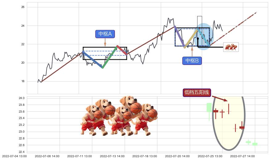 ➢ 【中枢B】:07-04:14-08-02:14,中枢由4笔构成,共43交易小时, ZG=23.64, ZD=21.80