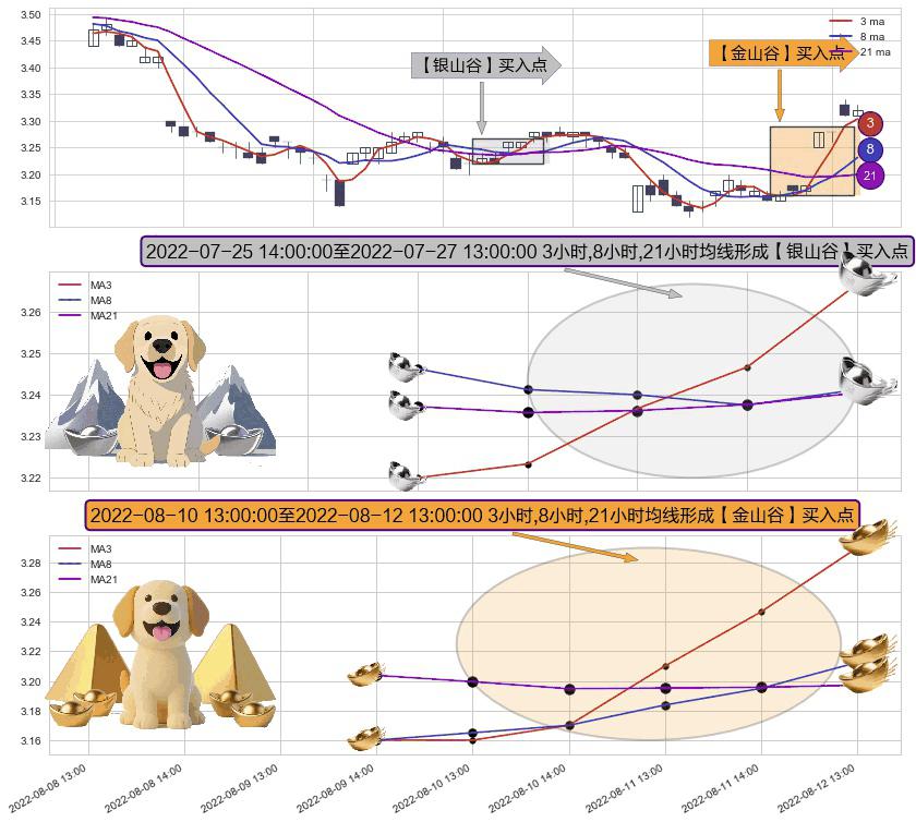 ⚄ 2022-08-10 14:00:00-小时至2022-08-12 13:00:00-小时显现 3小时-8小时-21小时均线 【金山谷】买入点 其再次确认了买入信号,可靠性更强,买入