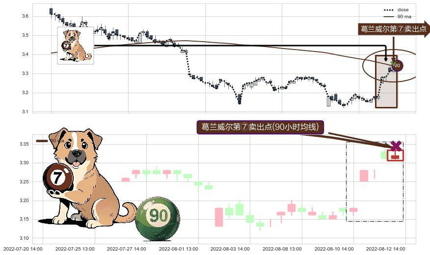 ⚀ 2022-08-12 14:00:00-小时显现 葛兰威尔均线 90小时均线 第⑦卖出点 下降趋势的中继信号,后市看跌,卖出信号