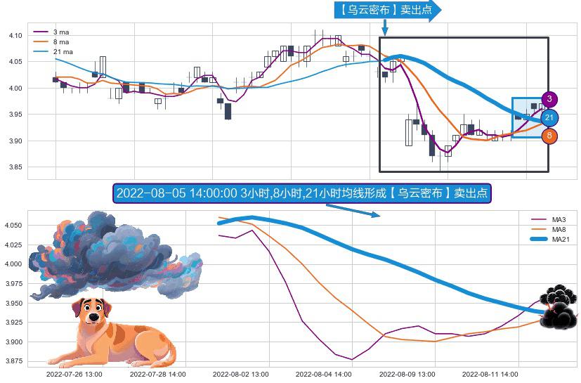形态多维评估: ⚀ 2022-07-29 14:00:00小时-2022-08-12 14:00:00小时显现 3小时-8小时-21小时均线 【乌云密布】卖出点 看空信号,后市看跌,卖出