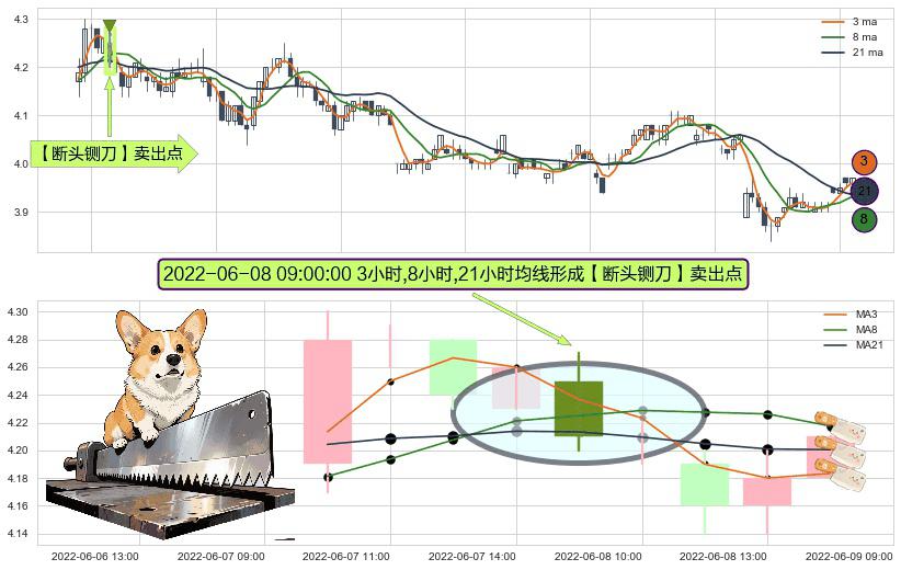 形态多维评估: ⚀ 2022-06-08 09:00:00小时显现 3小时-8小时-21小时均线 【断头铡刀】卖出点 看空信号,后市看跌,卖出