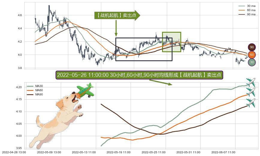 形态多维评估: ⚀ 2022-05-16 09:00:00小时-2022-06-08 14:00:00小时显现 30小时-60小时-90小时均线 【战机起航】卖出点 看空信号,后市看跌,卖出
