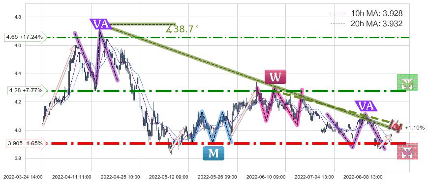 🦴 长线均值回复组合短线趋势跟踪[强阻力信号]2022-04-13 09:00-2022-08-12 13:00下跌趋势依然成立(下跌趋势跟踪依然存在),短线价格略微上行反弹(均值回复猜想),即将接近下跌趋势提供的未破位阻力价格:4.01。