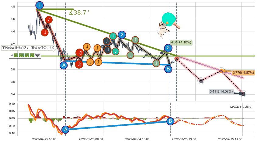 ♘ 在最后的下跌阶段2022-04-13 09:00至2022-08-12 13:00,存在 持续未破位的阻力位 ,阻力价格4.01,可信任强度83.83%,其距离最后价格3.970相差 +1.10%