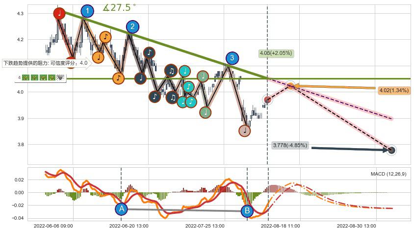 ➢ 预测:2022-08-17 11:00,【小幅反弹】稳定目前下跌趋势的前提下,预测价格:4.02