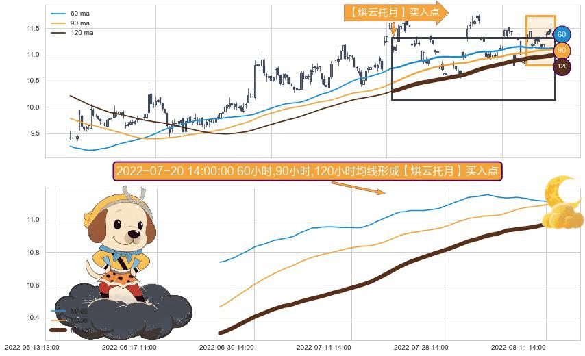 ⚀ 2022-06-27 13:00:00小时-2022-08-12 14:00:00小时显现 60小时-90小时-120小时均线 【烘云托月】买入点 看多信号,后市看涨,买入