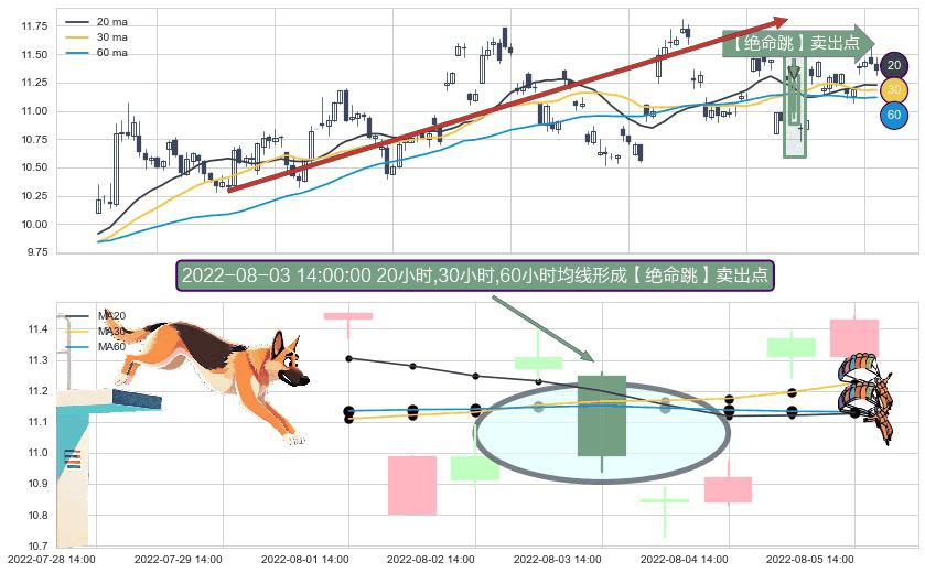 ⚀ 2022-08-03 14:00:00小时显现 20小时-30小时-60小时均线 【绝命跳】卖出点 看空信号,后市看跌,卖出