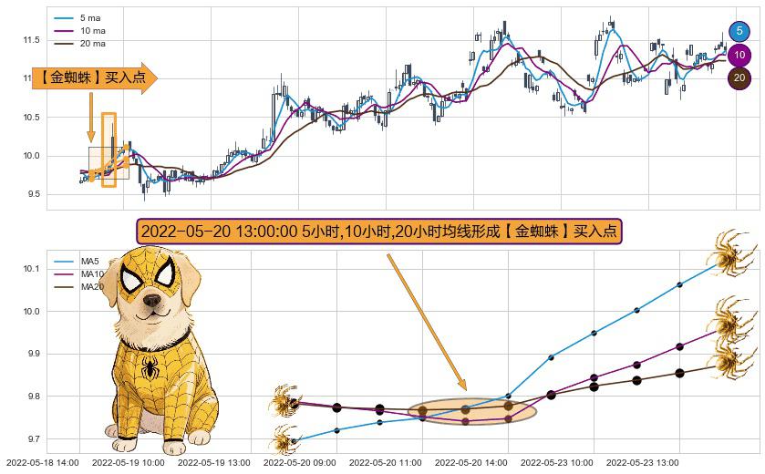 ⚀ 2022-05-20 13:00:00小时显现 5小时-10小时-20小时均线 【金蜘蛛】买入点 看多信号,后市看涨,买入