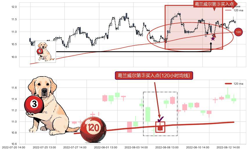 ⚀ 2022-08-04 14:00:00-小时显现 葛兰威尔均线 120小时均线 第③买入点 上升趋势的中继信号,后市看涨,买进信号