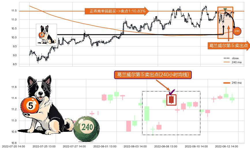 ⚀ 2022-08-05 14:00:00-小时显现 葛兰威尔均线 240小时均线 第⑤卖出点 上升趋势均值回复的短线回落信号,后市看跌,卖出信号
