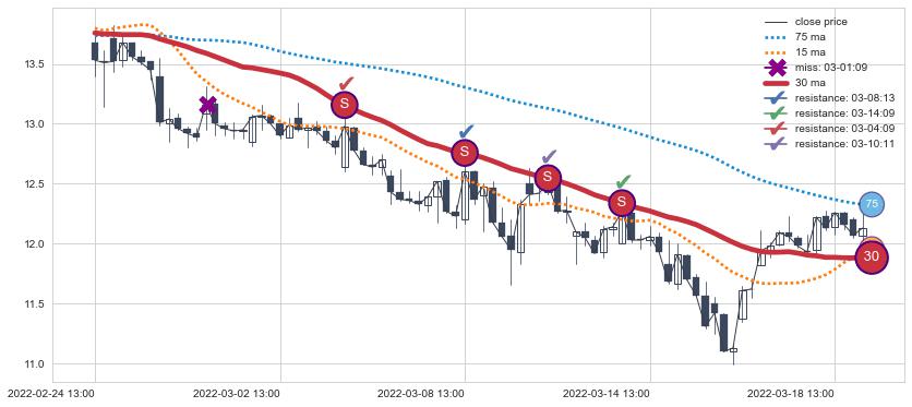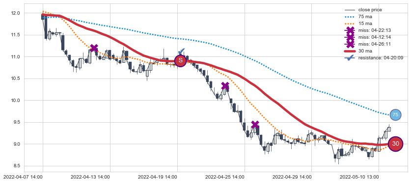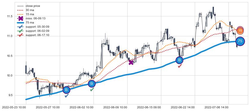 ⚂ 2022-07-15 14:00:00-小时均线向下破位,2022-08-04 14:00:00-小时重新上穿突破均线,均线支撑再次生效