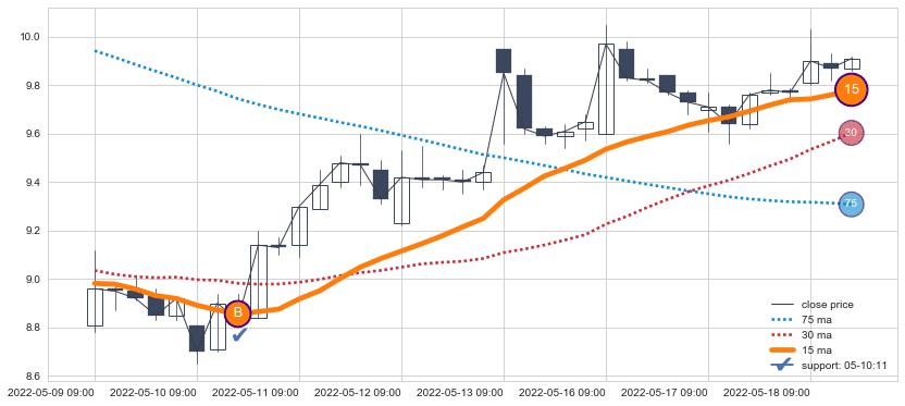 ⚂ 2022-06-13 09:00:00小时突然冒出一根大阳线,一下子顶穿三条均线且收盘价收在各条均线之上
